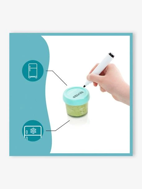 Les pots sont gradués en ml et en oz et possèdent une grande zone réinscriptible sur le couvercle. Vous notez simplement la recette conservée et la date de création par exemple