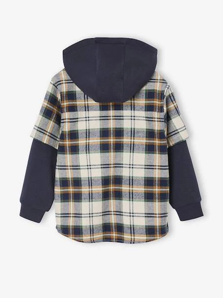Chemise effet 2 en 1 double matière garçon : Chemise 100% coton. Manches et capuche en molleton 80% coton, 20% polyester. Capuche doublée 100% coton.
