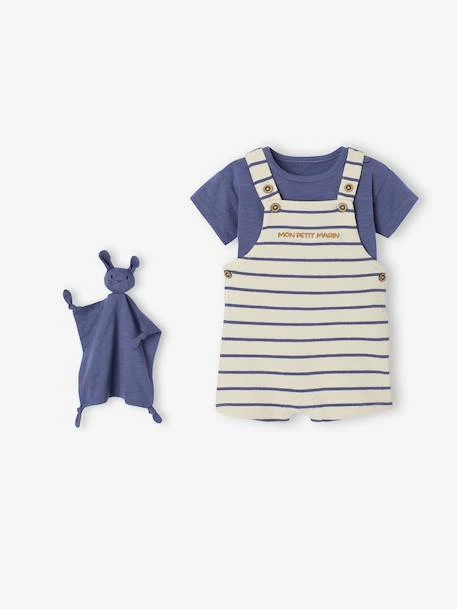 Un ensemble bébé 3 pièces qui va faire craquer les parents ! Un T-shirt à manches courtes, une salopette courte et un adorable doudou, un joli coffret cadeau pour accueillir bébé.