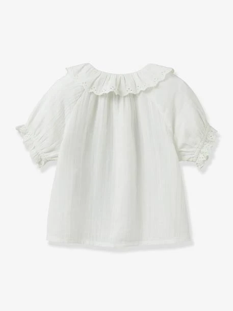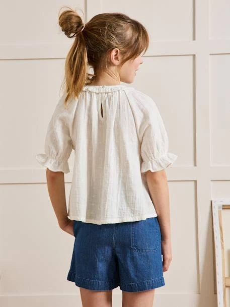 Chemise en gaze de coton douce et légère. Large col froncé et manches courtes élastiquées. L’esprit bohème chic est accentué par la broderie anglaise au col et aux bas de manches..