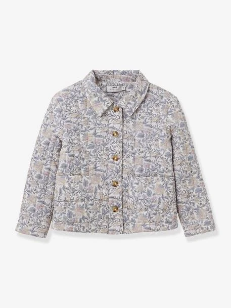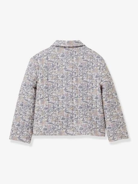 Une veste chic confectionnée dans un imprimé exclusif sur un tissu matelassé effet boutis. Veste forme boîte avec piqûres verticales, col, boutons devant effet corne et 2 poches plaquée. Cette veste se porte dès le printemps et réchauffe les tenues d’été.