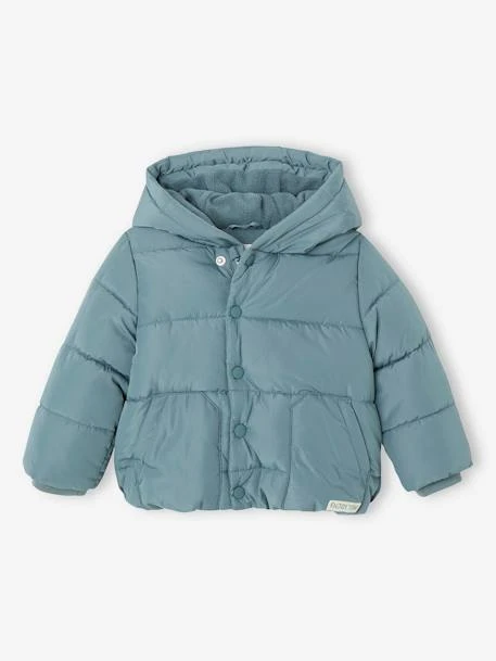 Doudoune à capuche bébé : Dessus 100% polyamide. Doublure maille polaire 100% polyester. Doublure manches 100% polyester. Garnissage 100% polyester recyclé.