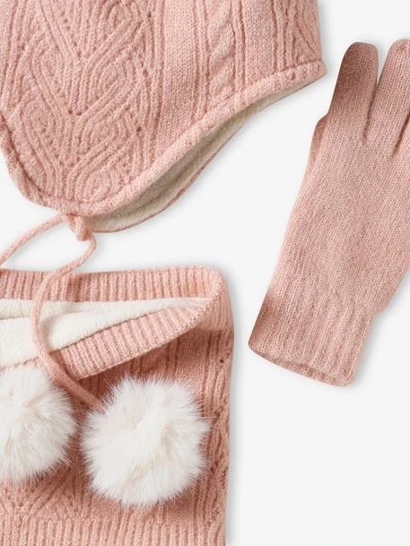 Ensemble bonnet + snood + gants/mitaines fille 95% acrylique, 5% polyester.