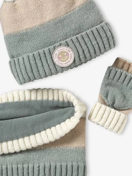 Ensemble bonnet + snood + moufles/mitaines fille en maille 100% polyester, doublure en maille polaire 100% polyester.