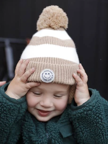 - Bonnet forme péruvien avec pompon sur le dessus et badge « Everyday is a new adventure, just smile* » sur le devant