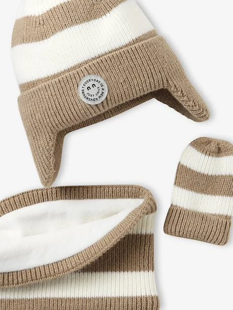 Le bonnet style péruvien, c’est génial pour garder toujours les oreilles bien au chaud ! Avec ce trio coordonné comportant aussi un tour de cou doublé et des moufles, bébé est paré pour toute la saison.