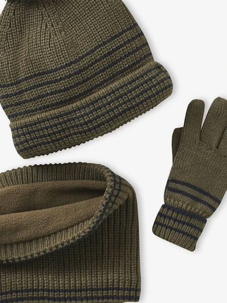 - Ensemble garçon composé d’un bonnet + un snood + une paire de moufles ou gants