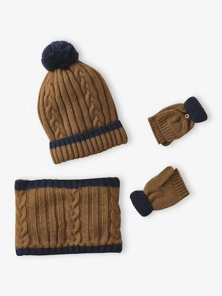 - Ensemble garçon composé d’un bonnet + un snood + une paire de moufles transformables en mitaines