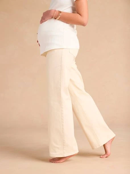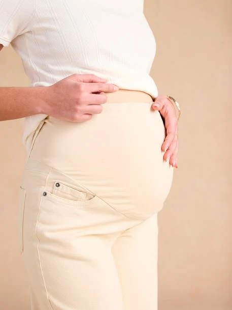Jean de grossesse : en toile 99% coton, 1% élasthanne. Bandeau seamless en maille 95% polyamide, 5% élasthanne