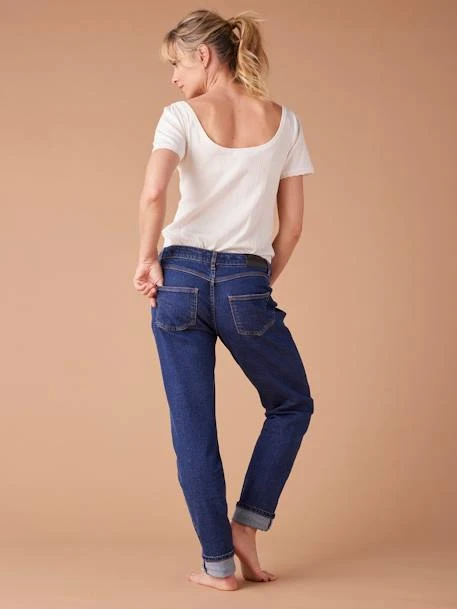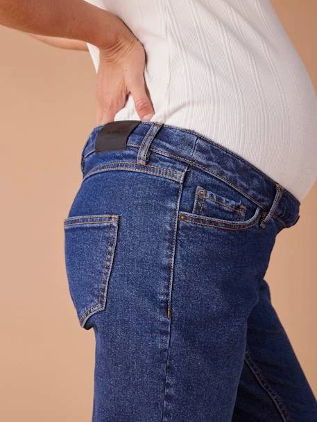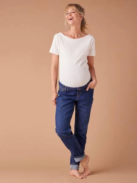 Jean Mom de grossesse en *denim waterless 98% coton, 2% élasthanne. Bandeau en maille extensible 95% coton, 5% élasthanne.