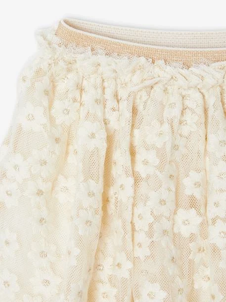 Jupe en tulle brodé fleurs : tulle 100% polyamide. Broderies 84% coton 14% polyester, 2% fibres métallisées. Doublure 100% coton