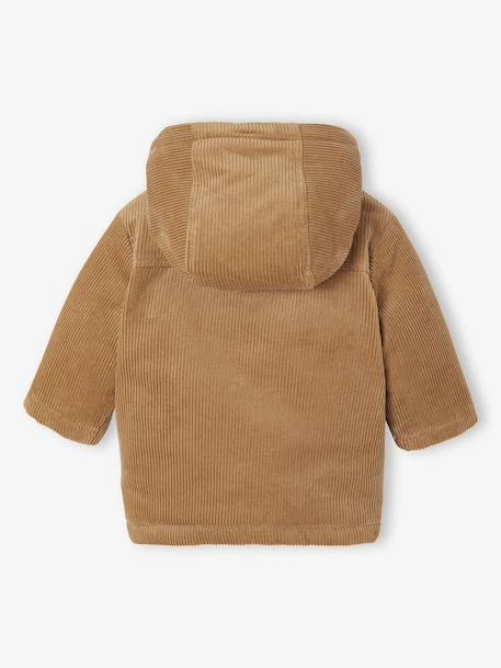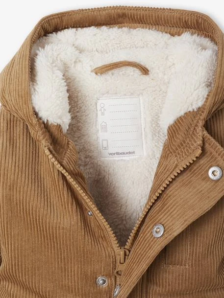 Manteau bébé en velours côtelé 100% coton, doublure en fausse fourrure 100% polyester, garnissage 100% polyester recyclé.