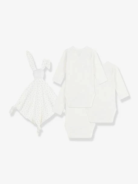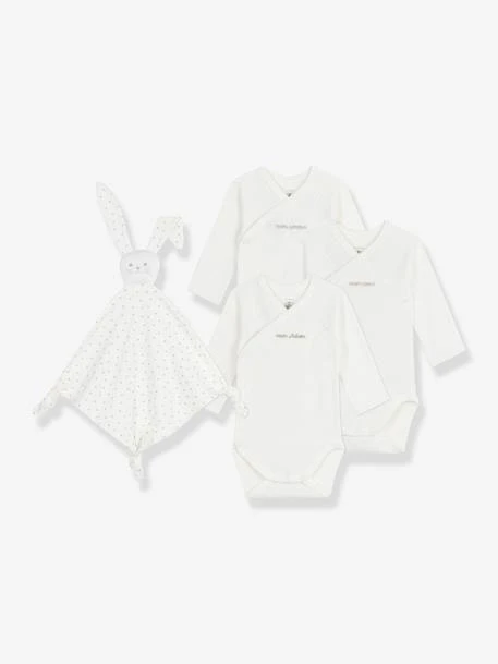 Coffret cadeau naissance 3 bodies et doudou 100% coton issu de l’agriculltre biologique.