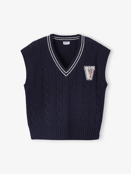 Un pull sans manches style collège pour réchauffer les chemises et t-shirts ! Un style sport-chic trop cool pour la rentrée ! On adore le jeu de torsade, le col rayé et le badge, parfait pour donner du style à un t-shirt basique, un jean ou une jupe.