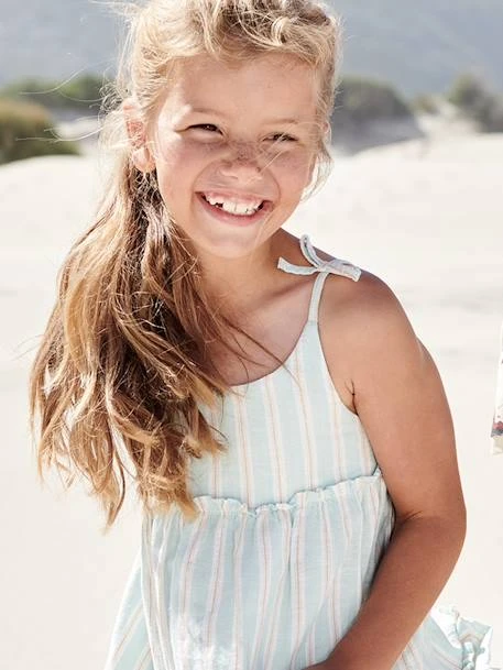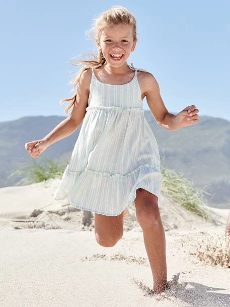 Craquez pour cette petite robe rayée parfaite pour profiter des beaux jours ! Animée de rayures et de fils brillants pour le bonheur des filles, elle est en coton et lin, une matière agréable à porter l’été. On adore le coloris bleu aqua pile dans la tendance parfait pour rafraichir leur dressing estival !