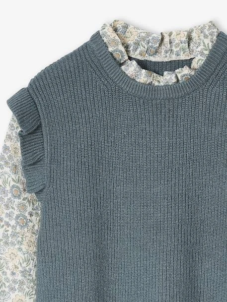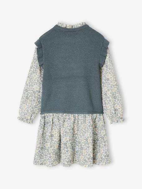 Robe 2 en 1 bi-matière fille : pull en tricot léger 48% viscose, 32% polyester, 20% polyamide. Parties imprimées 100% coton.