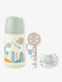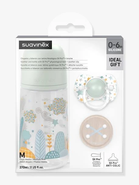 Idéal pour répondre aux besoins du nouveau-né et contribuer à un bon développement bucco-dentaire, ce coffret cadeau Suavinex est constitué d’un biberon Dreams 270 ml, d’une sucette orthodontique spécial nouveau-né et d’un attache-sucette aux motifs nature tendre et coordonnés à tous les éléments.